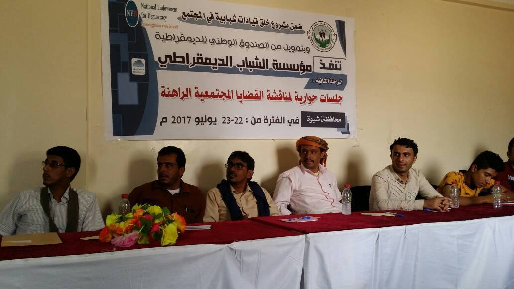 عقدت مؤسسة الشباب الديمقراطي اليوم في قاعة معهد سمارت للتدريب بعتق عاصمة محافظة شبوة جلسة حوارية لمناقشة أبرز القضايا المجتمعية الراهنة.
