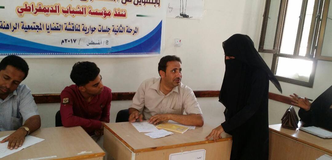 ضمن المرحلة الثانية من برنامج خلق قيادات شبابية فاعلة في المجتمع ، الذي تنفذه مؤسسة الشباب الديمقراطي والممول من الصندوق الوطني للديمقراطية ، و على طريق تشكيل مكون مناصرة مدنية بوادي حضرموت ، قام فريق التنفيذ بوادي حضرموت يوم الخميس الموافق:2017/8/10م بعقد الجلسة الحوارية الخامسة (الإضافية) بمدينة القطن حيث خصصت الجلسة لموضوعي المناصرة و تشكيل مكون من نشطاء الشباب والشابات لمناصرة قضايا الحقوق المدنية بوادي حضرموت.